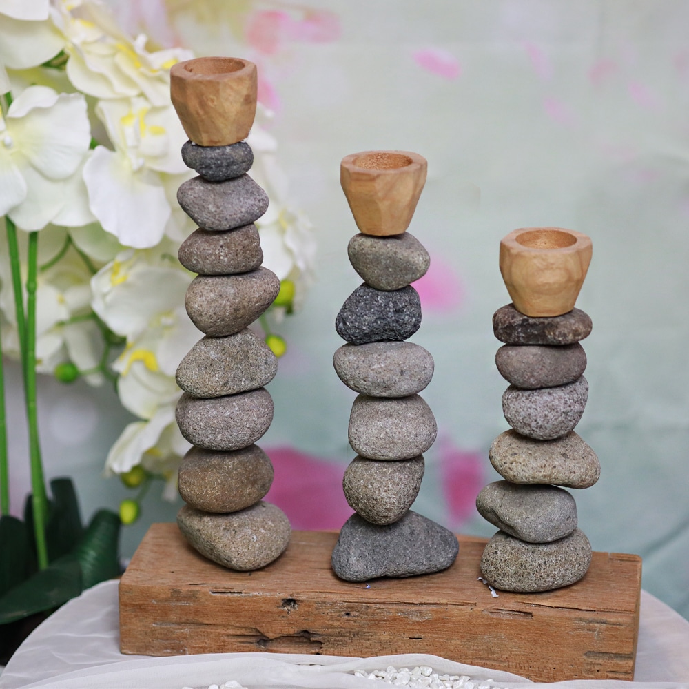 Dieser elegante Kerzenhalter kombiniert natürliche Materialien mit zeitlosem Design. Drei unterschiedlich hohe Halter aus graubraunem Naturstein sitzen auf einem robusten Teakholzfuß und verleihen jedem Raum eine besondere Atmosphäre....