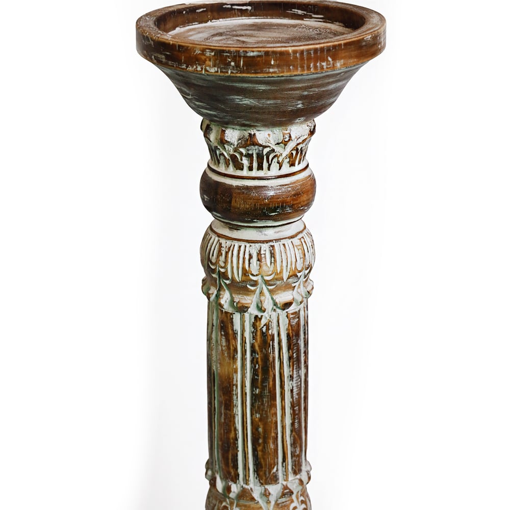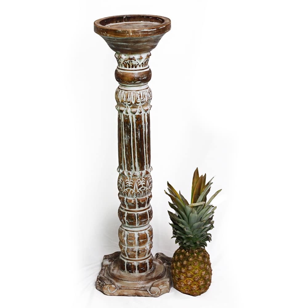 Dieser handgefertigte Blumenständer aus Albesia-Holz besticht durch traditionelle balinesische Schnitzereien und ein modernes dunkelbraunes Finish mit dezentem Whitewashed-Effekt. Mit einer Höhe von 77 cm ist er ideal, um Pflanzen oder Vasen elegant in Szene zu setzen....