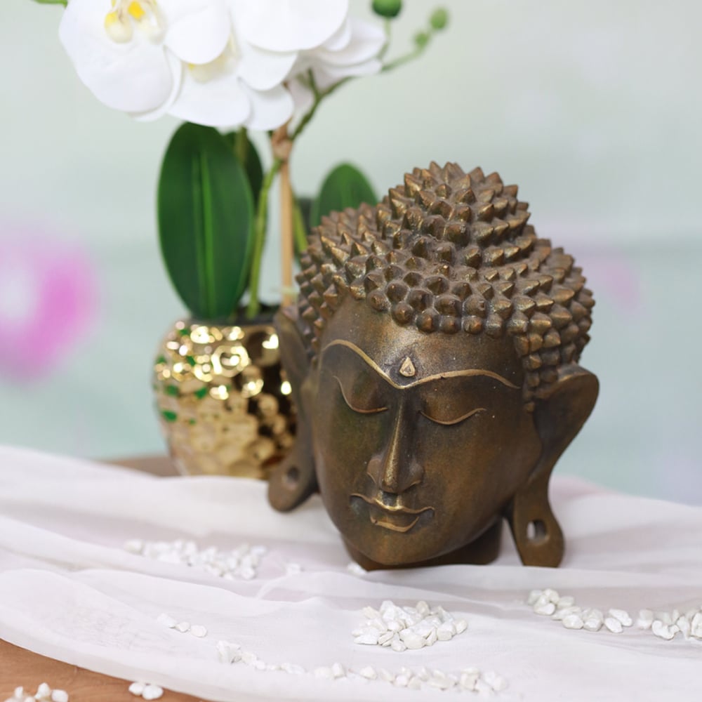 Dieser Buddha Kopf besticht durch seine traditionelle und seltene Darstellung des Buddha-Gesichts. Mit einer Höhe von 18 cm und der kunstvollen Handarbeit wird er zum besonderen Blickfang. Die kupferfarbene Oberfläche verleiht ihm eine edle, warme Patina mit zeitlosem Charme....