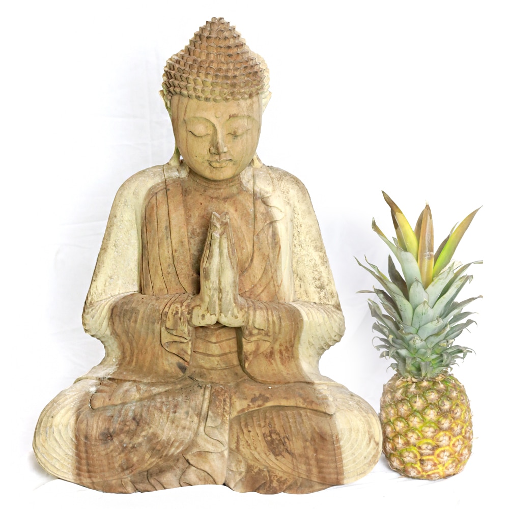 Diese kunstvoll handgefertigte Buddha Statue aus Teakholz besticht durch ihre natürliche Holzstruktur und eine Höhe von 60 cm. Die meditative Pose mit gefalteten Händen symbolisiert Ruhe und innere Ausgeglichenheit....