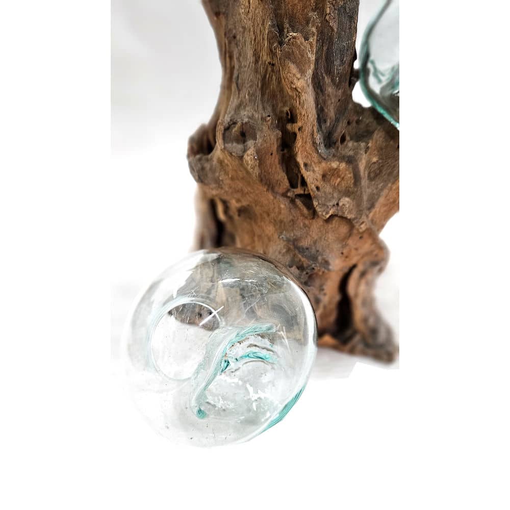 - Material: Geschmolzenes Glas auf naturbelassenem Wurzelholz