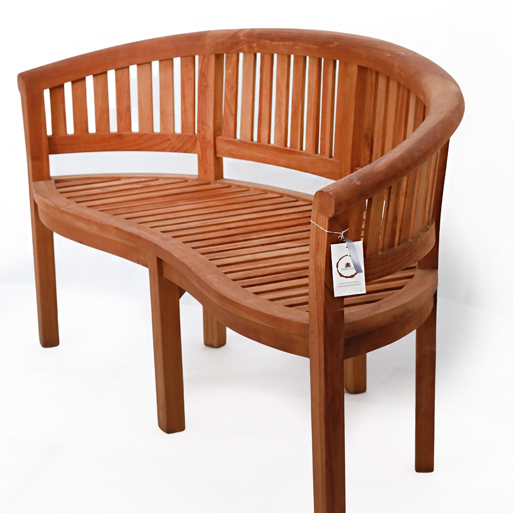 Elegante Teakholzbank mit geschwungener Form, 158x64x85 cm