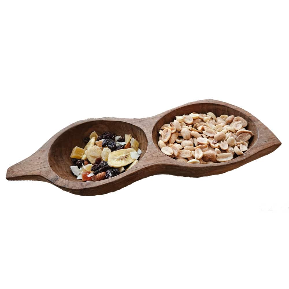 Diese handgefertigte Schale aus robustem Teakholz überzeugt durch ihr natürliches Design und bietet mit zwei getrennten Fächern eine stilvolle Lösung zur Präsentation von Nüssen, Trockenfrüchten oder anderen Snacks – perfekt für jeden Anlass....