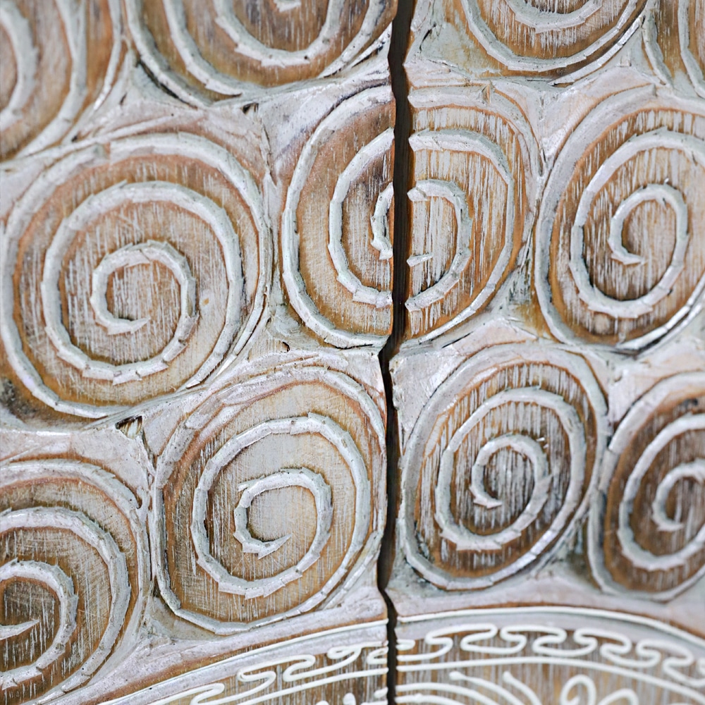Dieses handgefertigte Wandrelief aus Bali verbindet spirituelle Gelassenheit mit kunstvoller Eleganz. Mit einer Größe von 40 x 40 cm zeigt das Dekor einen Buddha, umgeben von fein geschnitzten Ornamenten im traditionellen balinesischen Stil. Die White-Washed-Optik verleiht dem Stück eine sanfte, antike Ausstrahlung, die sich harmonisch in moderne sowie klassische Wohnräume einfügt.