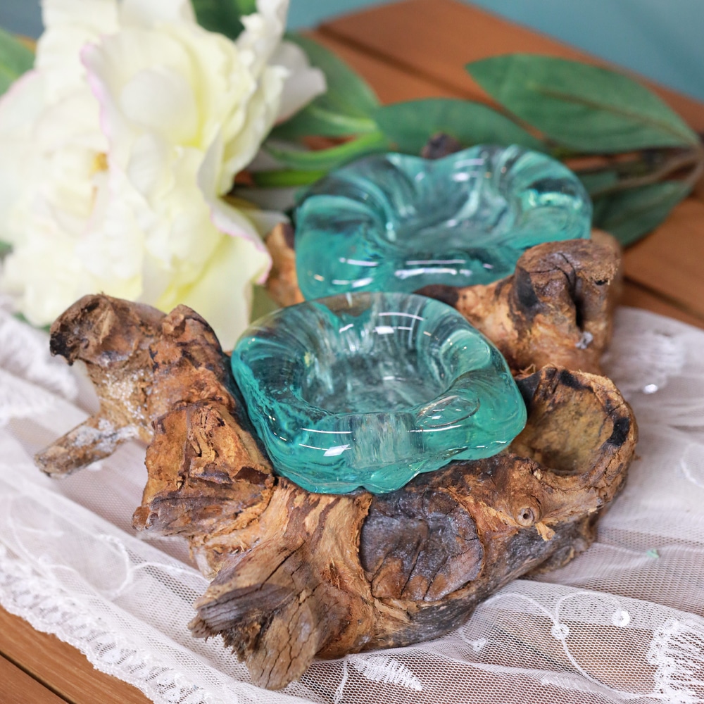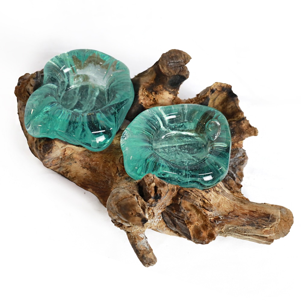- Material: Handgeschmolzenes Glas auf naturbelassenem Wurzelholz