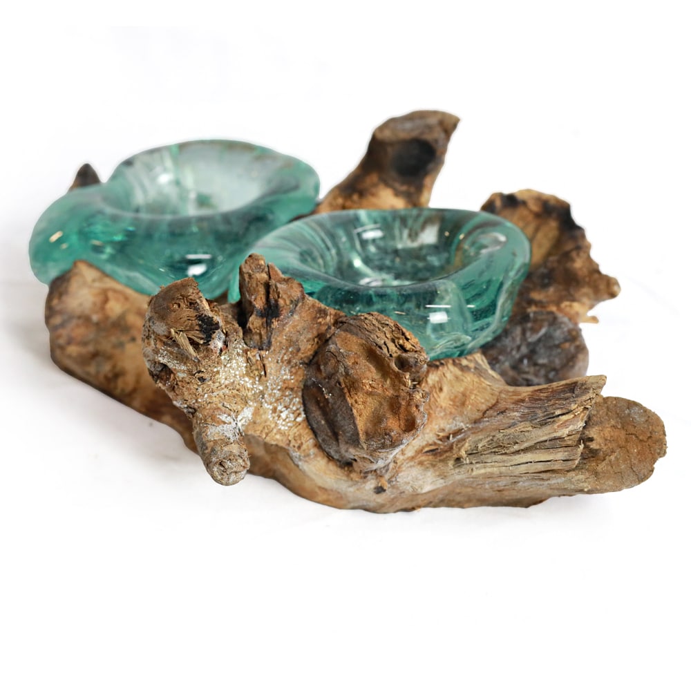 Kasih Kerzenhalter: Zwei Glasschalen auf natürlichem Wurzelholz, 30 cm
