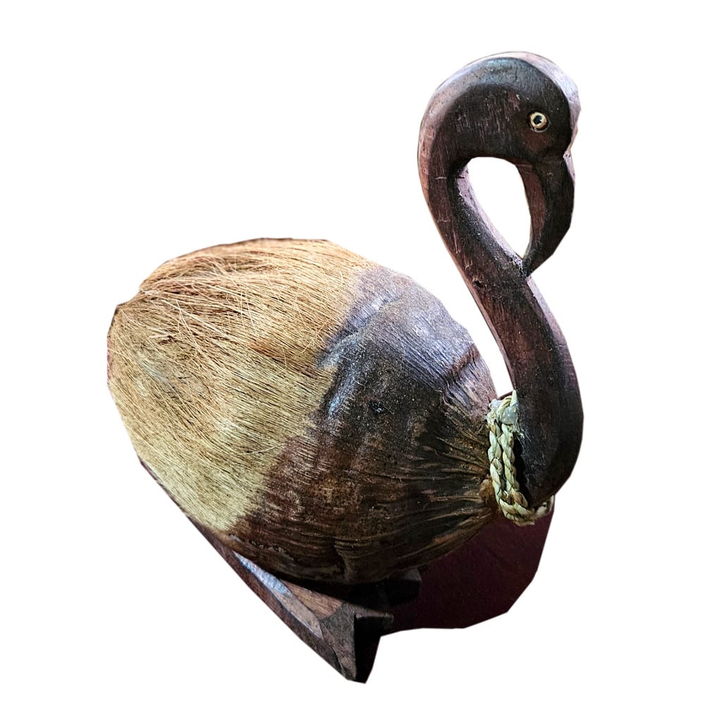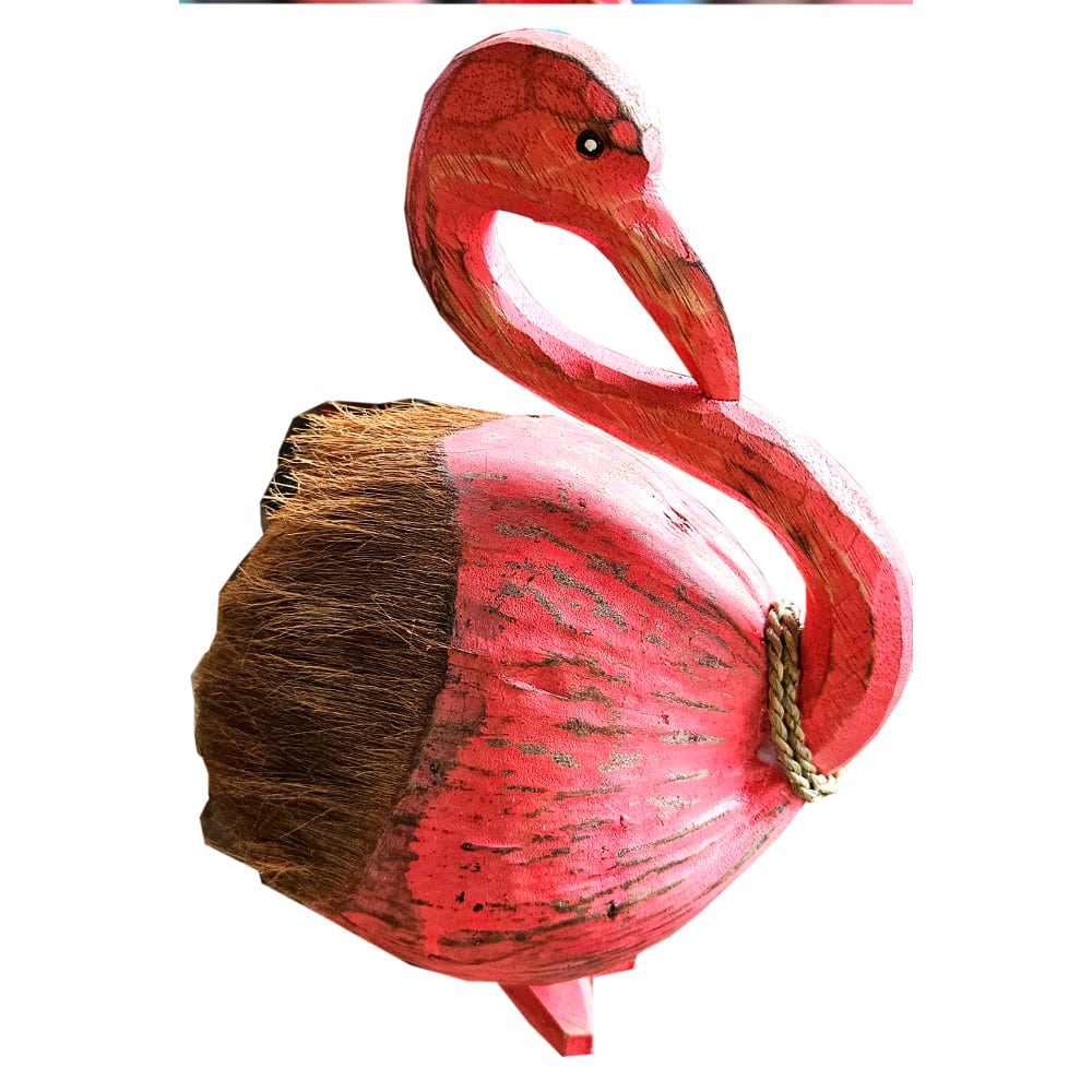 Doch während das Fruchtfleisch gegessen und das Wasser getrunken wird, beginnt für die Schale ein neues Kapitel. In kleinen Werkstätten verwandeln erfahrene Hände die harte Hülle in etwas Unerwartetes – Tierfiguren, Masken, kleine Schalen oder wie bei unserem Kemala Kokosnuss-Flamingo: ein geduldiger Geselle mit Charme.