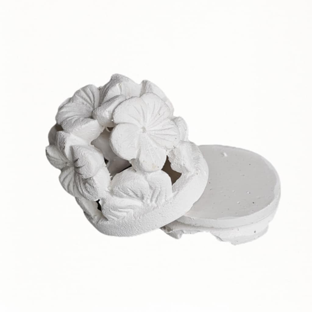 Der handgefertigte Teelichthalter „Melati“ aus weißem Gips verbindet balinesische Handwerkskunst mit einem filigranen Plumeria-Design. Mit einer Höhe von rund 10 cm lässt er das Kerzenlicht sanft durchscheinen und schafft so eine entspannte und stimmungsvolle Atmosphäre – perfekt für Wohnbereiche, Badezimmer oder Meditationsplätze....