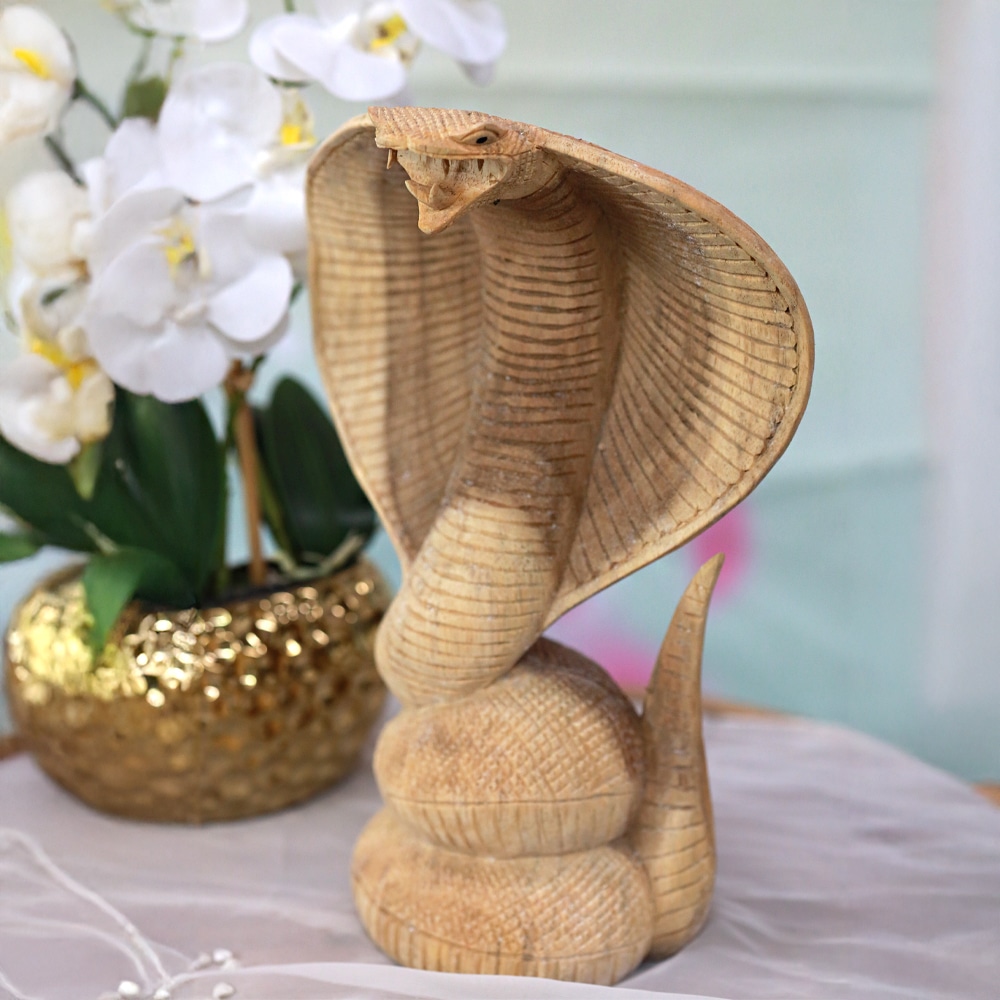 Die Naga Raja Kobra ist in zwei Größen erhältlich (ca. 30 cm und ca. 40 cm) und zieht als kraftvolles Symbol und dekorativer Blickfang alle Blicke auf sich.