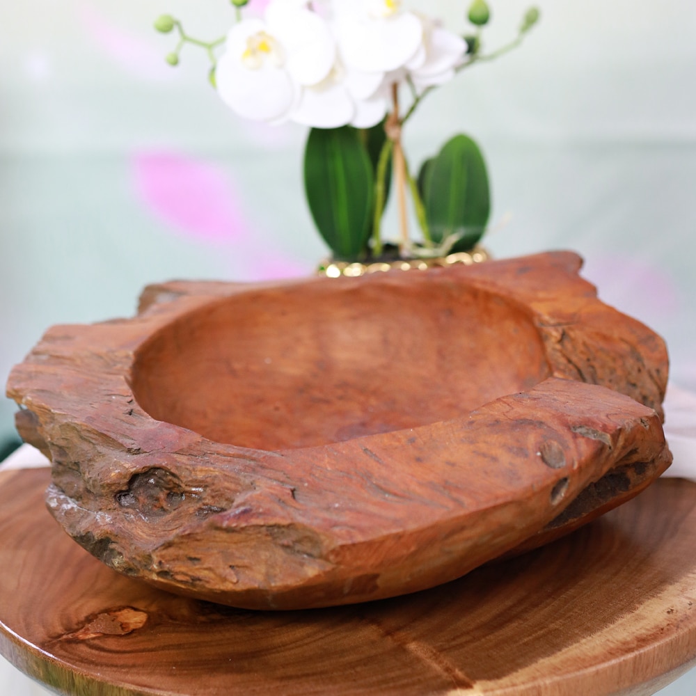 Diese handgefertigte Teakholzschale besticht durch ihre natürliche Schönheit und einzigartige Maserung. Mit 40 cm Durchmesser eignet sie sich perfekt als Obstschale, dekoratives Highlight oder stilvolle Aufbewahrung. Der naturbelassene Rand macht jedes Stück zu einem individuellen Unikat....