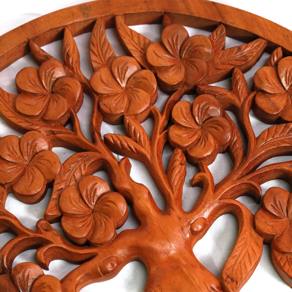 Bringen Sie balinesisches Flair in Ihre Räume mit diesem liebevoll handgefertigten Wanddekor aus robustem Teakholz. Das 40 cm große, runde Relief zeigt den „Jepun“-Baum (Frangipani) in detailreicher Ausführung und steht symbolisch für Frieden und Anmut....