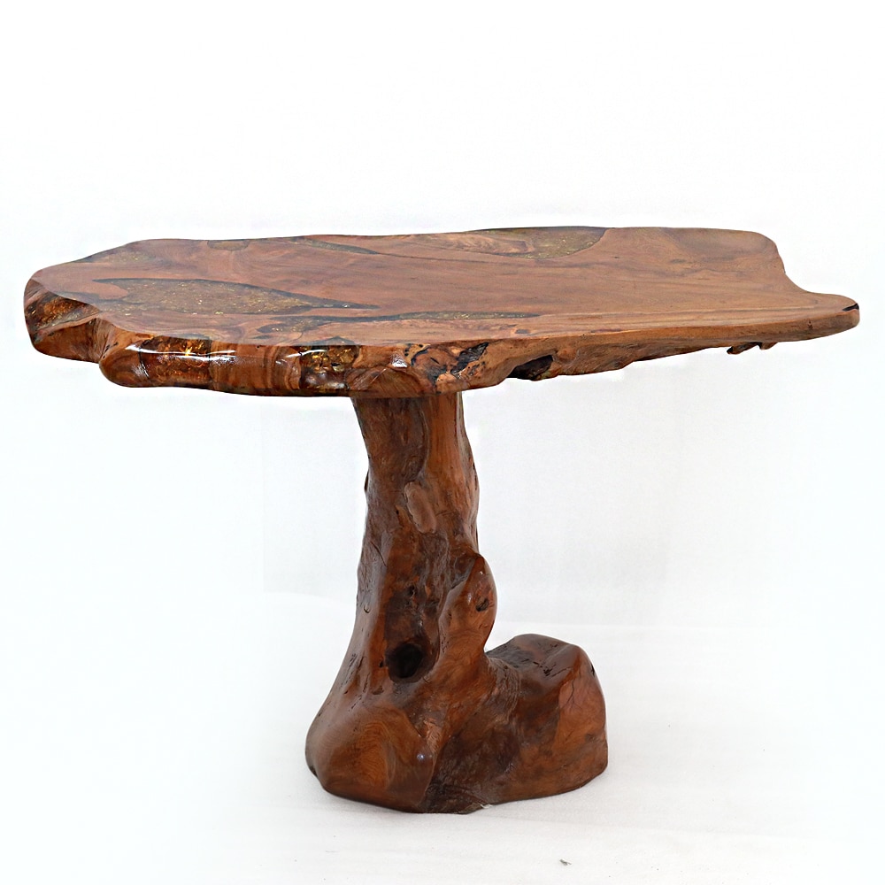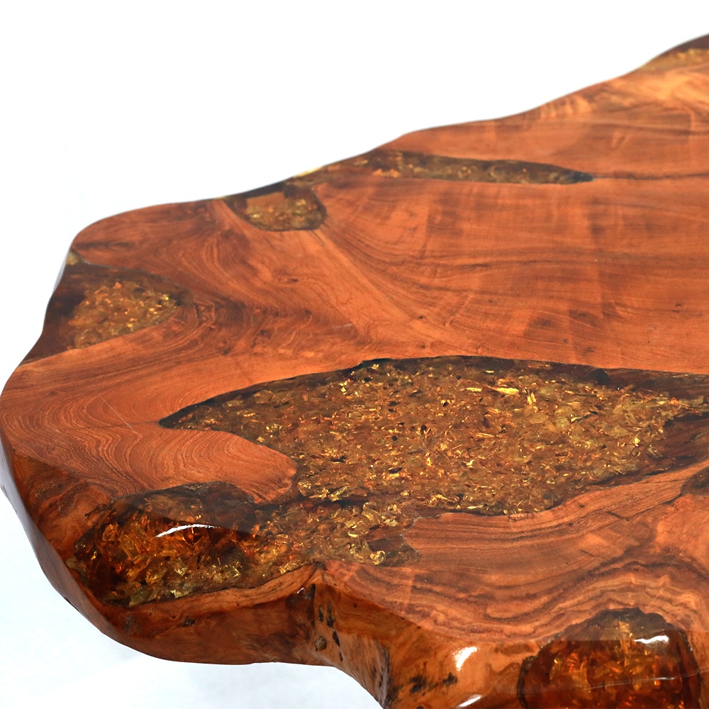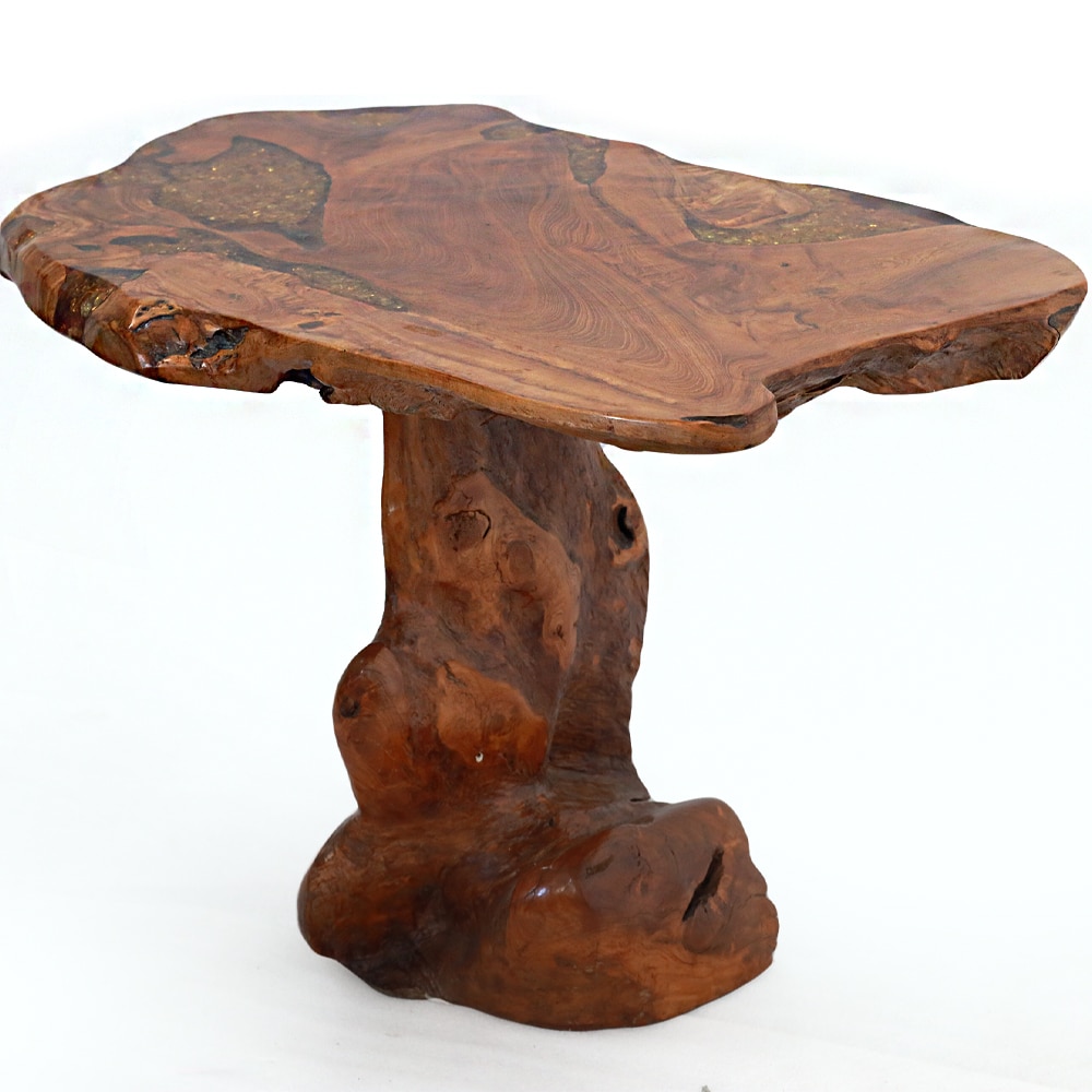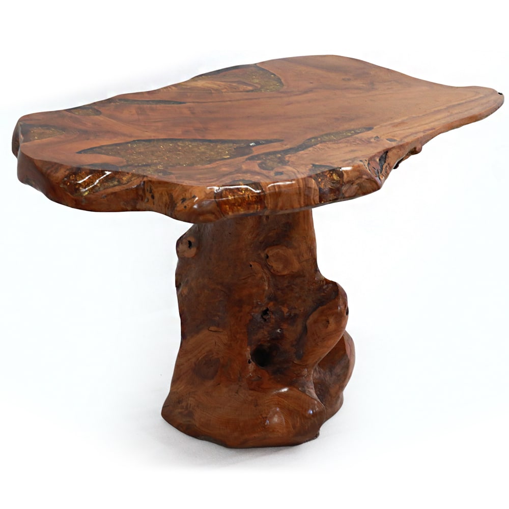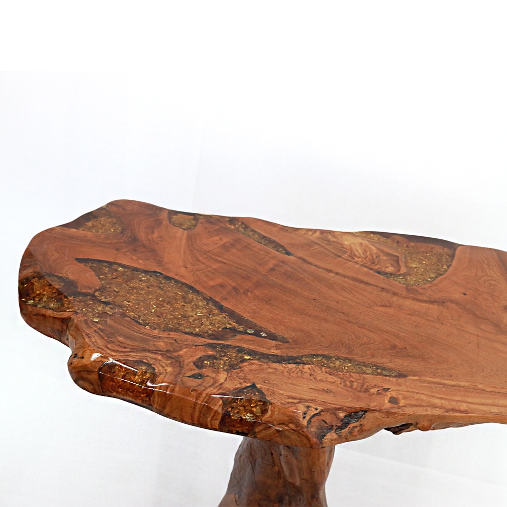 - Material: Massives Teakholz kombiniert mit goldfarbenem Kunstharz, Wurzelfuß aus einem Stück