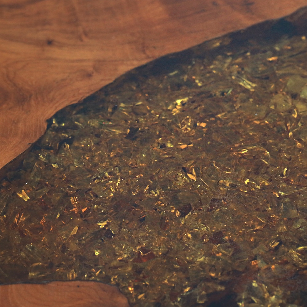 - Design/Form: Flussartig verlaufende Harzeinlage auf einer naturbelassenen Holzplatte