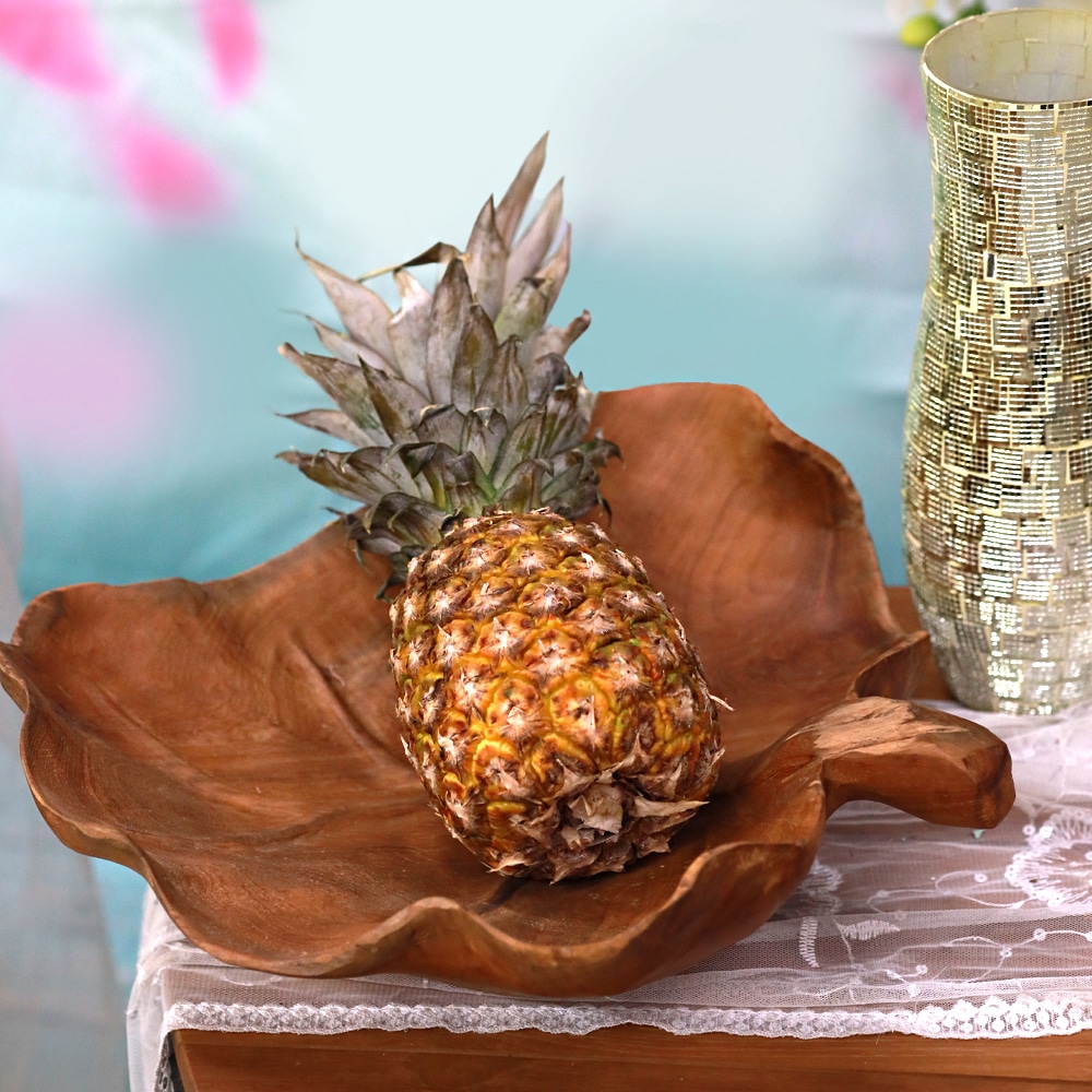 Diese handgefertigte Obstschale aus Teakholz besticht durch ihr organisches Blattdesign und bringt natürliche Wärme in Ihr Zuhause. Jedes Stück ist ein einzigartiges Unikat mit individueller Maserung und Größe....
