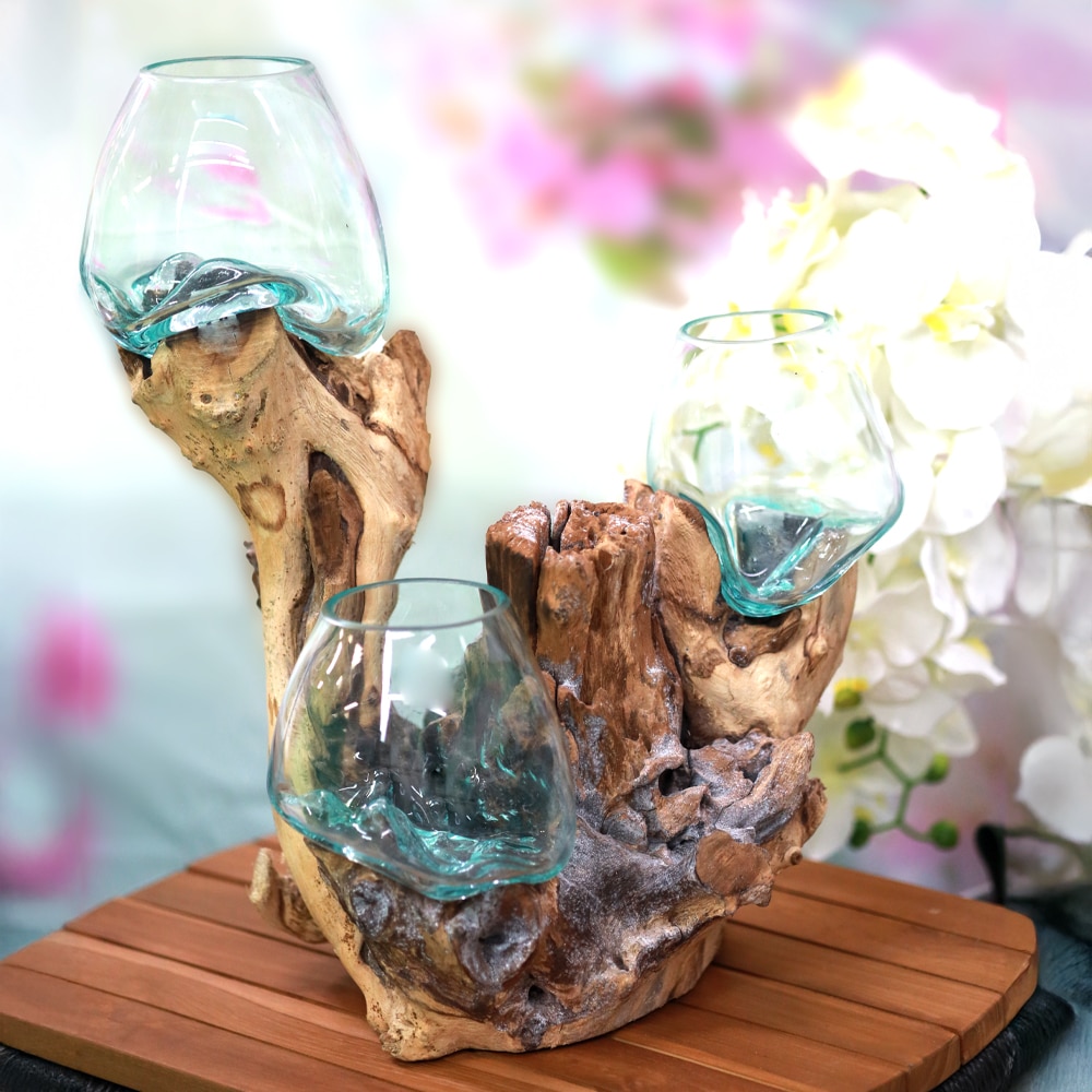 In Bali spiegelt Handwerk stets eine tiefe Verbindung zur Natur wider. Das Verschmelzen von Glas auf Wurzelholz ist eine besondere Technik, die dieses Zusammenspiel eindrucksvoll zum Ausdruck bringt.