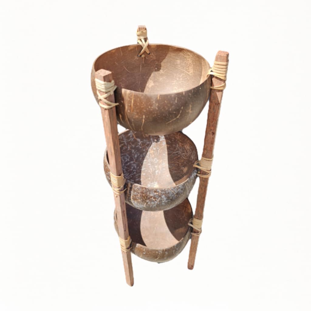 Die Schalen entstehen aus recycelten Kokosnusshälften, die von Hand geschliffen und gebohrt werden. Die Verbindung der einzelnen Ebenen erfolgt mittels feiner Holzstäbe, die mit natürlichen Sisalfasern gebunden sind – ganz ohne Metall oder Kunststoff. Die Konstruktion ist stabil und bewusst natürlich gehalten: sichtbare Fasern, kleine Unebenheiten und Farbnuancen sind keine Fehler, sondern Ausdruck echter Handarbeit und machen jedes Stück einzigartig.