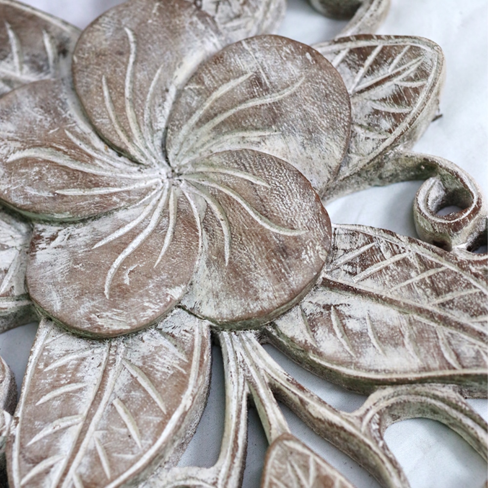 Rundes Wandrelief mit Frangipani-Blüte, 40 cm, aus Teakholz